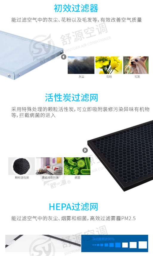 一、過濾凈化空氣:讓空氣流通,室內(nèi)不用開窗就可呼吸到室外過濾后的新鮮空氣。舒源空調(diào)(http://www.iuc5475g.cn/)采用三層過濾網(wǎng),初效、活性炭和HEPA三重過濾。三重過濾不多也不少,少了過濾效果不到位,多了后期維護更新麻煩。